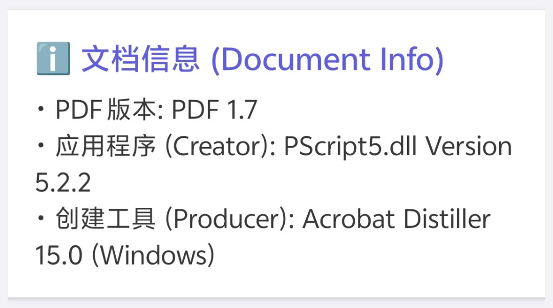 1、文档基本信息 (Document Info)在这里只看对印刷有用的。PDF 的版本、Creator(应用程序)和 Producer(导出工具)。是的,我经常用这些信息,来判断这份PDF来自哪个可能听都没听过的软件。