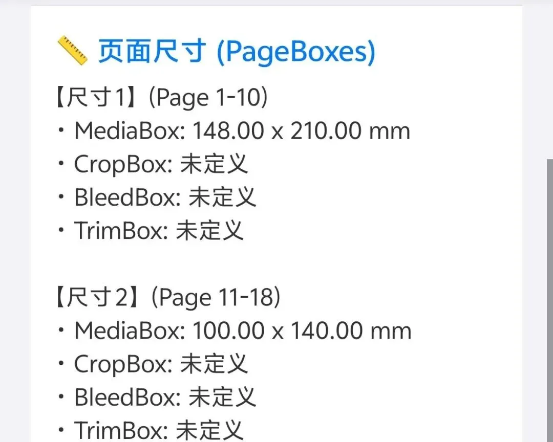 2、页面框尺寸 (PageBoxes)真正的印刷人都知道,PDF不能只看页面,Pagebox才是重点。在「MYPDF」中,MediaBox、CropBox、BleedBox(出血框)、TrimBox(裁切框)安排得明明白白。如果遇到不同尺寸的多页文档,还会自动分类,告诉你“第 1-12 页是什么尺寸,第 13、15 页是什么尺寸”,一目了然。