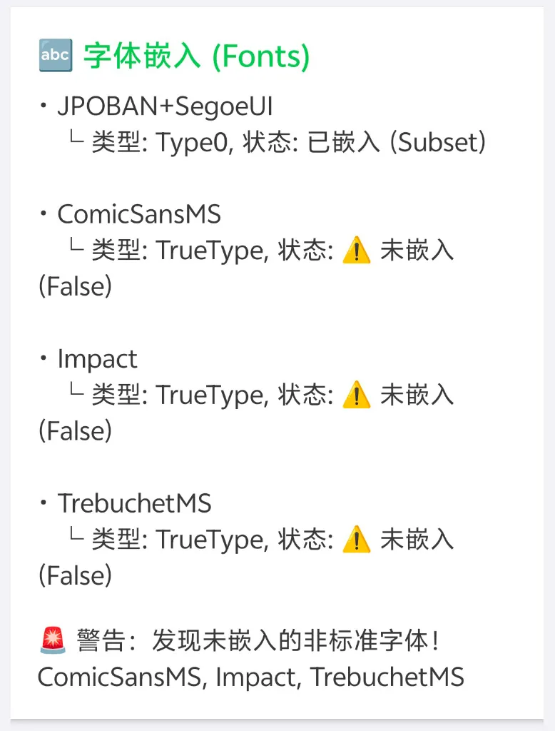 已嵌入?子集嵌入?还是忘了转曲也忘了嵌入?如果有未嵌入的非标准危险字体,底部会直接用警报发出提示。