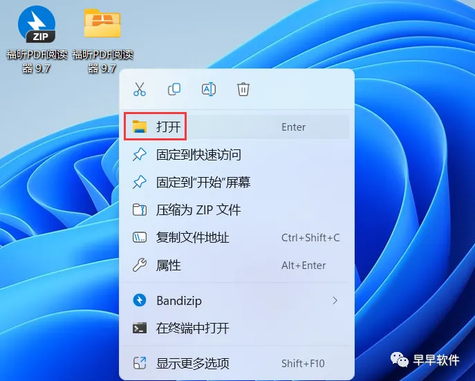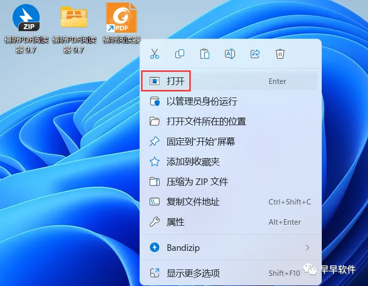 21、回到桌面,右键桌面上的【福昕阅读器软件图标】,点击【打开】
