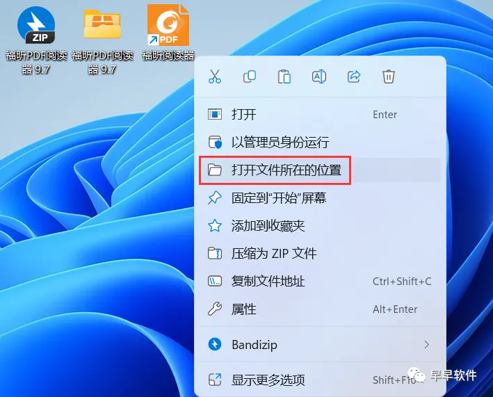 16、回到桌面,右键桌面上的【福昕阅读器软件图标】,点击【打开文件所在的位置】