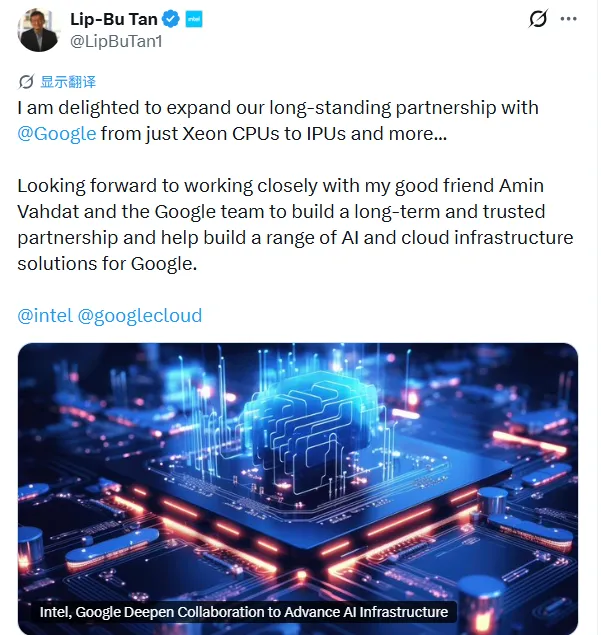 英特尔CEO陈立武在社交媒体表示:英特尔正与谷歌深化合作,从传统CPU扩展到AI基础设施(如IPU),共同推进AI与云计算能力建设。