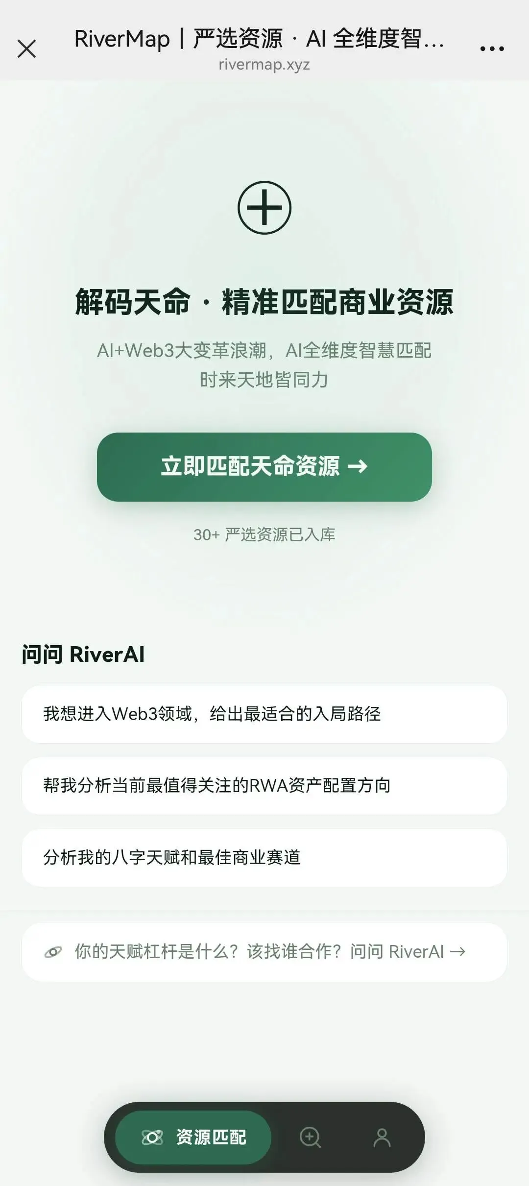 「RiverMap」作为亚洲首个全维度天命智慧商业匹配引擎,在AI+Web3 的大变革浪潮中,致力于彻底解决人与资源、时机、环境的全维度错配痛点。我们专注于加速每一位超级个体(OPC)与传统赛道老板,通过解码底层天命密码,在瞬息万变的市场中快速、精准地锁定与自身基因高度契合的严选资源。