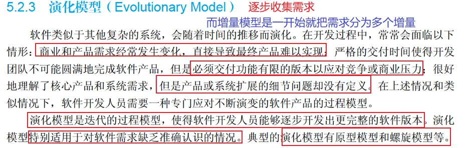 增量模型是每一次都开发出一个产品;原型是快速构建出一个系统框架,然后捕获用户需求进行迭代开发;
