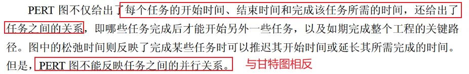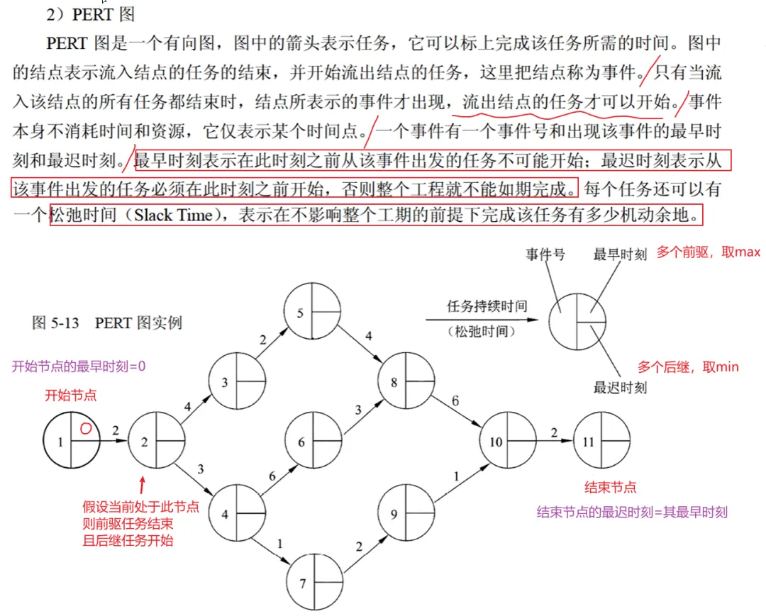 最早时刻:从开始节点算,每一个节点的最早时刻=其前驱节点的最早时刻+任务持续时间(如果有多个前驱,取最大值,因为要等所有前驱才能开始后继) 最迟时刻:从结束节点算,每一个节点的最迟时刻=其后继节点的最迟时刻-任务持续时间(如果有多个后继,取最小值,因为多个人跟你要结果,要能够响应最早和你要的人) 松弛时间:每一个节点的最迟时刻-最早时刻(如果有多个后继,如4节点,其松弛时间也有两个,各算各的) 关键路径:松弛时间为0的路径/任务组成的路径