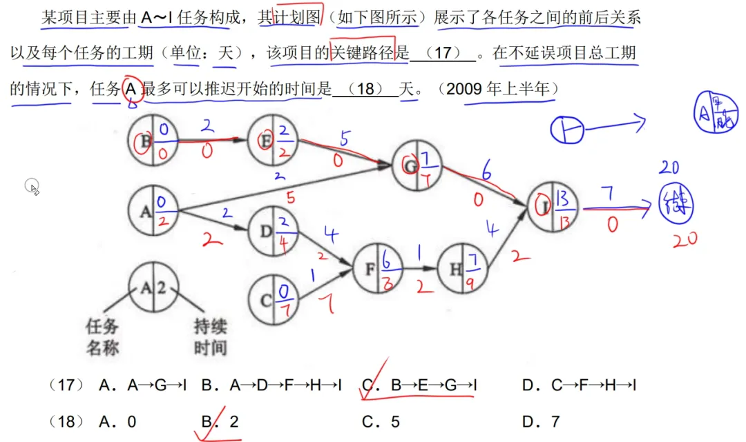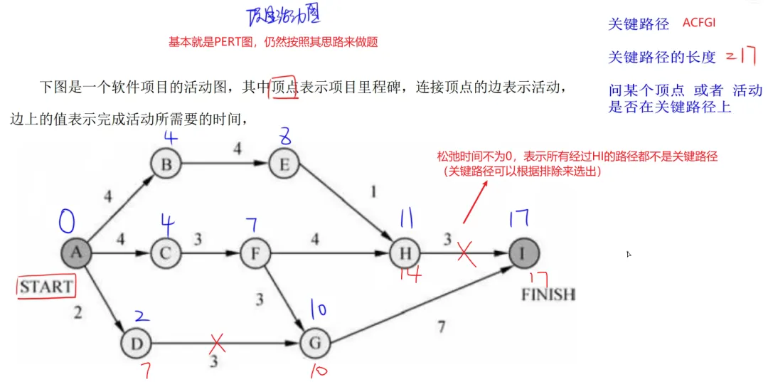 Tips:实际计算时不用求出所有节点的最迟时刻,可以反推。比如I节点的前驱H节点,最早和最迟不相等,所以所有经过HI的都可能是关键路径(即只能从上半部分的2条路径选),可以利用这个特性快速选择。