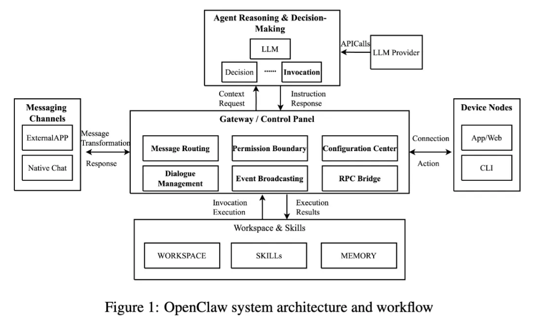 论文把它拆成四层:接入层、路由层、业务层、存储层。接入层负责接消息和标准化输入;路由层负责按用户、来源、会话去分发请求并做访问控制;业务层负责推理、上下文管理、工具调用和任务执行;存储层负责本地持久化配置、会话状态、日志和相关上下文数据。整个流程是“接收输入—匹配会话—推理与执行—状态落盘”的闭环。