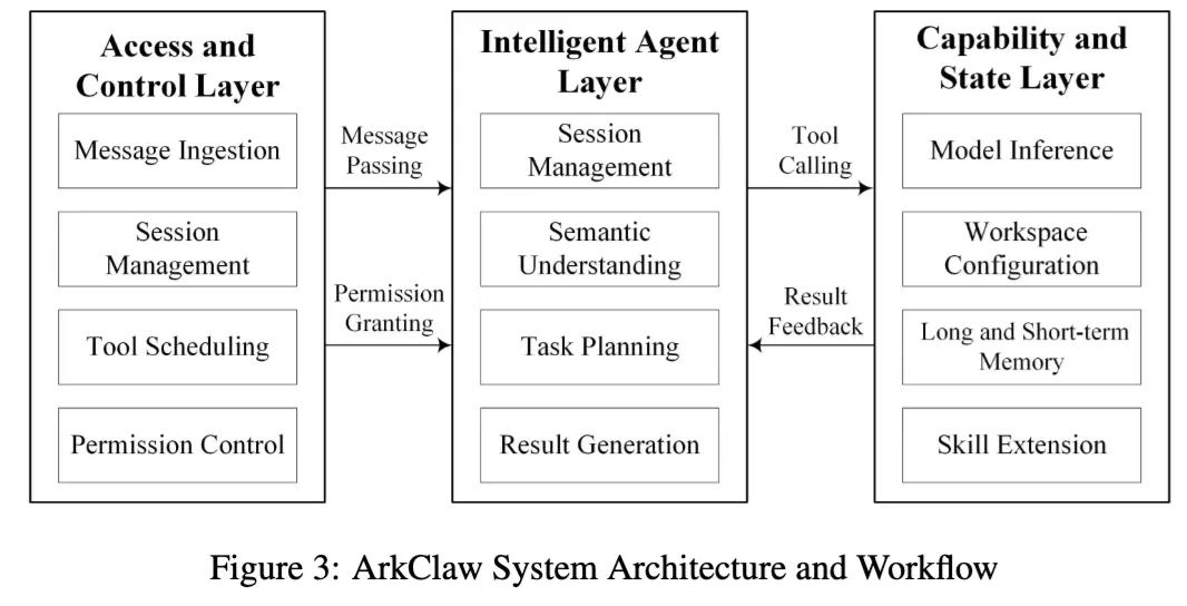 论文里说,OpenClaw 框架作为控制平面,负责统一运行环境、安全治理和资源调度;ArkClaw 作为执行平面,负责语义理解、任务规划和决策执行。它采用三层结构:上层是接入与控制层,中层是智能体层,下层是能力与状态层,同时强调记忆、状态和任务编排能力。
