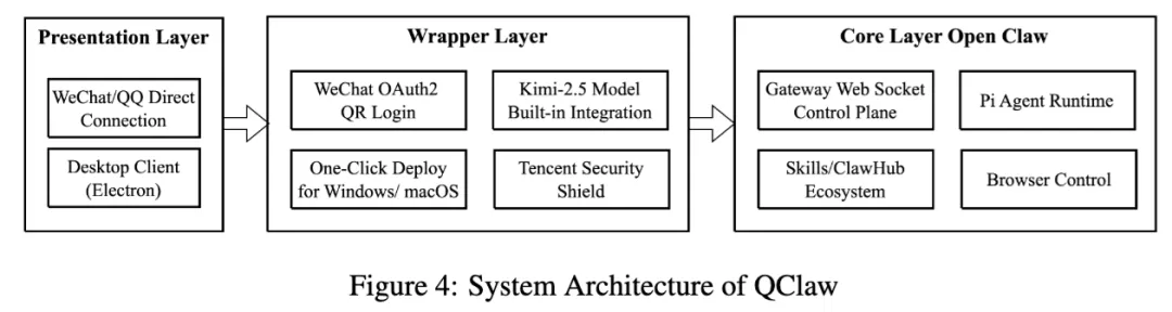 论文把它拆成三层:核心层、封装层、展示层。核心层建立在 OpenClaw 架构上,包含 Gateway WebSocket 控制面、Pi Agent 运行时以及 Skills/ClawHub 生态;封装层负责安全隔离和能力整合;展示层则是面向用户的 Electron 客户端,并且接入微信和 QQ。