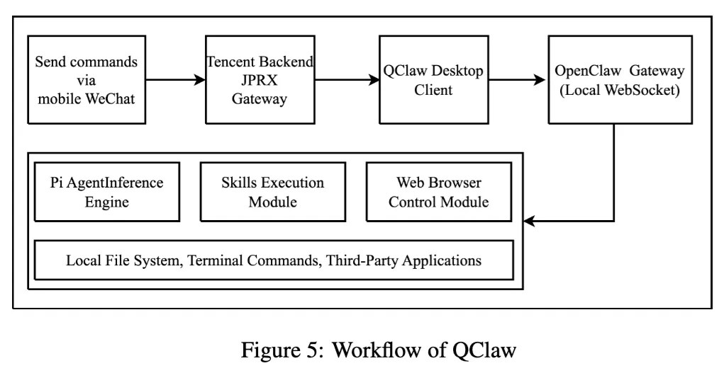 它的典型流程是:用户从微信发命令,经腾讯网关转发到本地 QClaw 客户端,再通过 WebSocket 进 OpenClaw Gateway,由 Pi Agent、Skills 和 Browser 一起完成闭环执行。