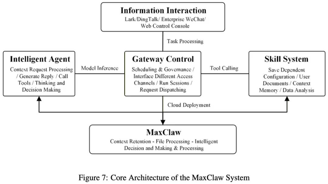 MaxClaw 面向云部署场景,架构上分为信息交互层、网关控制层、技术系统层和 Agent 层,云端提供算力与存储资源。它同样走“输入接收—任务解析—模型决策—工具执行—状态更新—结果返回”的循环流程,只不过整个系统都放在云上。论文认为,这种形态适合大规模任务,也更强调弹性和扩展性。