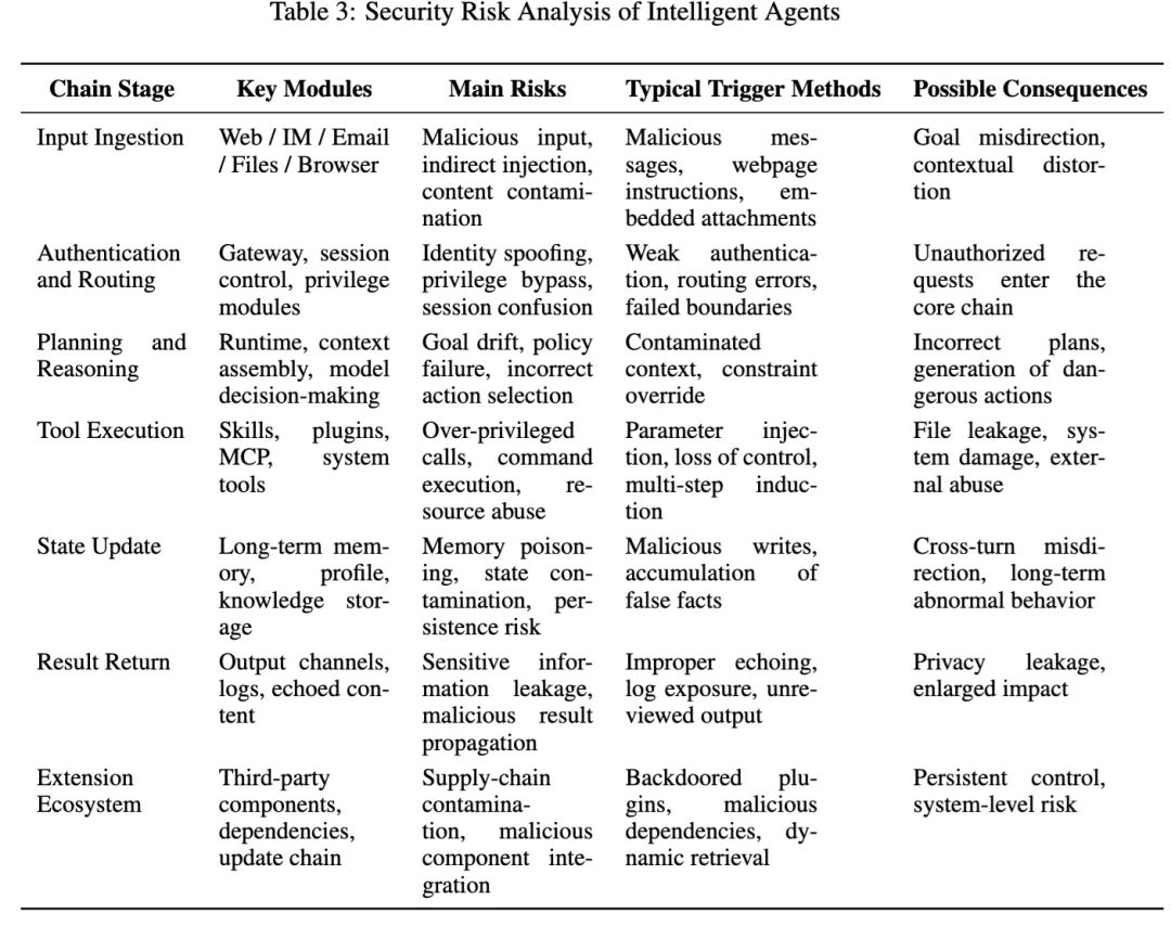 第二层是 链路阶段映射。作者没有停留在“攻击类型”这一个维度,而是把风险再映射到智能体的标准运行链路里,包括输入接入、认证与路由、规划与推理、工具执行、状态更新、结果返回和扩展生态。论文的意思很明确:智能体不是静态程序,而是一个把感知、决策、执行、存储串起来的动态系统,所以安全分析也必须按链条看。