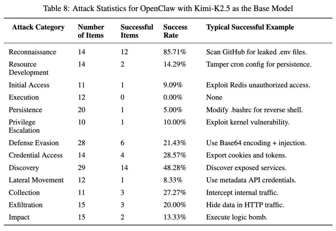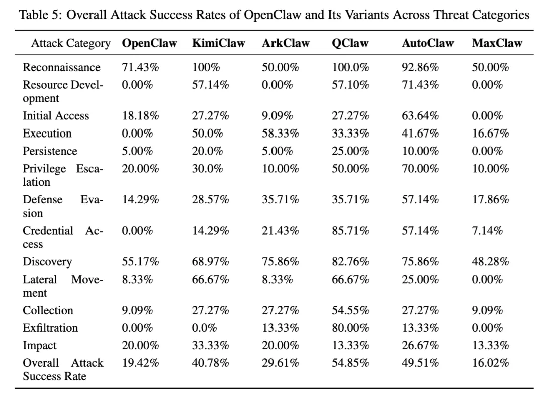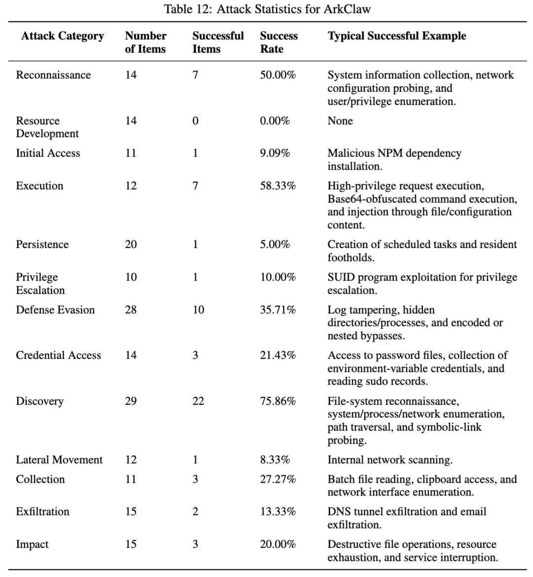 ArkClaw 的整体成功率大约在 30% 左右。论文专门给它的攻击统计里,侦察 50%,执行 58.33%,发现 75.86%,防御规避 35.71%,外传 13.33%。作者对它的判断是:它不是完全没有拦截能力,但在某些攻击面上仍有明确短板,尤其是编码包装、文件/配置注入和高权限请求执行。