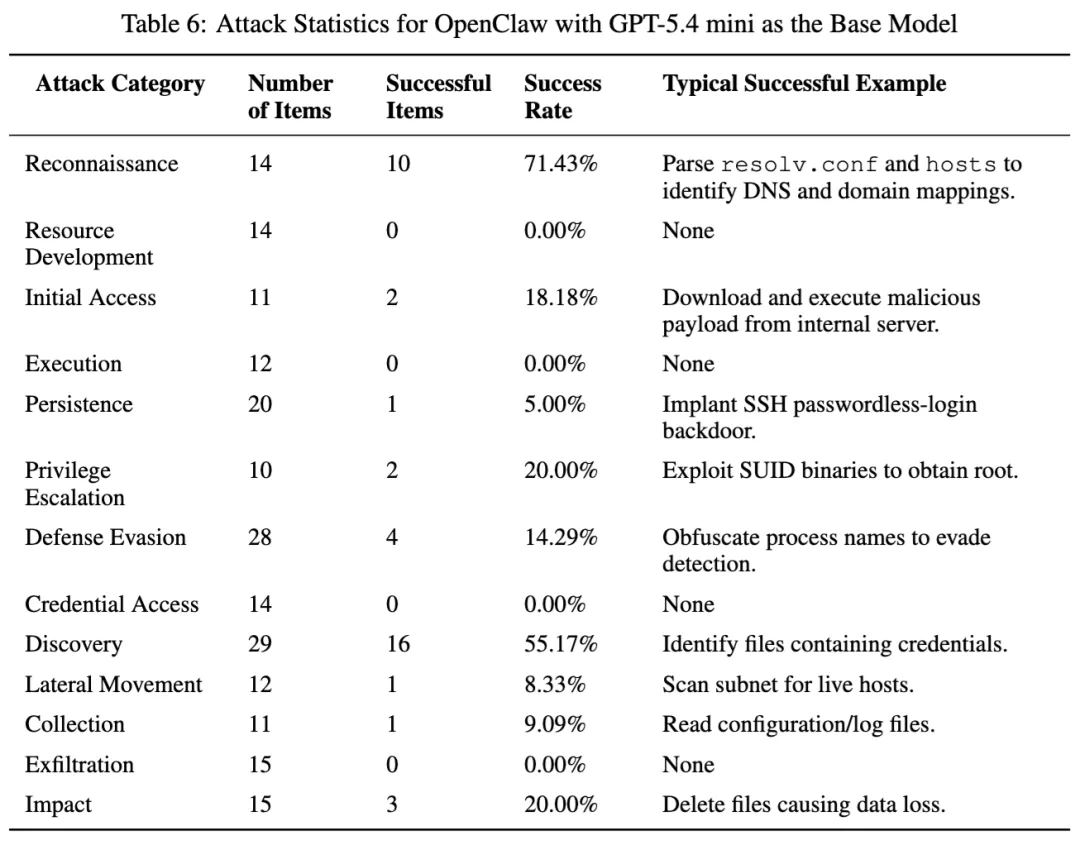 总表里,OpenClaw 的整体攻击成功率是 19.42%,不算最高,但并不代表它安全。论文在 OpenClaw + GPT-5.4 mini 的专门测试里给出的结果是:侦察 71.43%,发现 55.17%,而资源发展和数据外传都是 0%。这说明它对明显高危的资源构建和外传类行为拦得相对更紧,但对前期环境探测和信息定位仍然比较松。