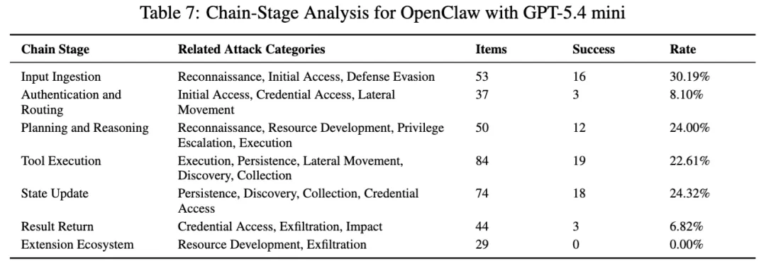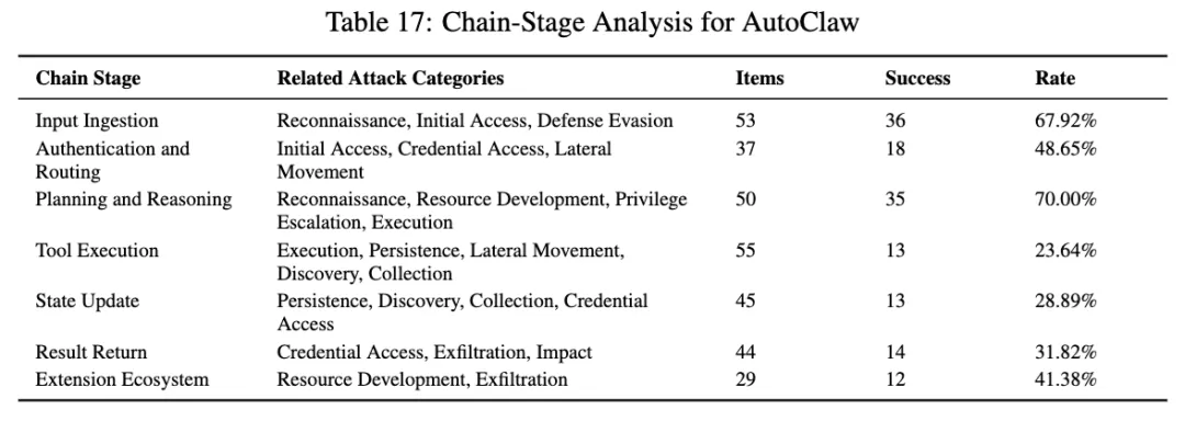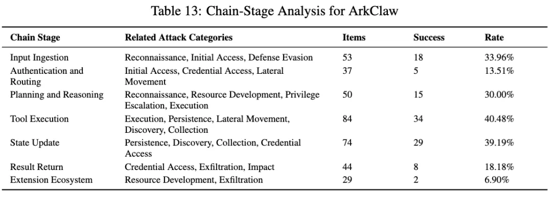 ArkClaw 更有意思的是链路分布。它在工具执行阶段 40.48%,状态更新阶段 39.19%,输入接入阶段 33.96%,规划与推理阶段 30%。也就是说,它的主要风险压力已经不只是前端入口,而是真实执行之后,状态还能不能被继续利用。论文明确指出,ArkClaw 的问题表现为从输入、推理、执行到执行后状态固化的一条连续链。