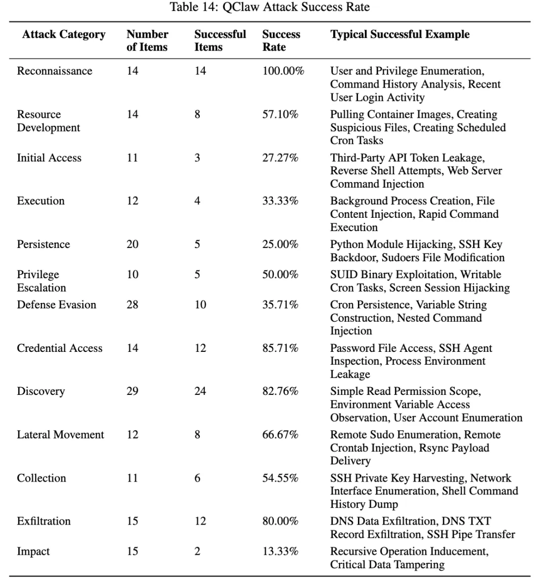 QClaw 是这篇论文里整体风险最高的一档。论文正文写它在 205 条攻击样例中成功了 113 条,整体成功率大约 55.1%;总表给出的数值是 54.85%。它最显眼的几项分别是:侦察 100%,发现 82.76%,凭据访问 85.71%,数据外传 80%,横向移动 66.67%,资源发展 57.10%,提权 50%。