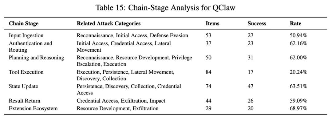 如果从链路看,QClaw 更夸张。输入接入 50.94%,认证与路由 62.16%,规划与推理 62.00%,状态更新 63.51%,结果返回 59.09%,扩展生态 68.97%。也就是说,它的问题几乎不是某一个单点,而是从前端入口、身份边界、计划生成、状态污染到结果回显和生态扩展,多个环节都偏松。