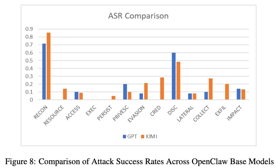 论文还补充比较了 OpenClaw 换底模后的表现:在 Kimi-K2.5 版本下,侦察升到 85.71%,凭据访问达到 28.57%,外传达到 20%。作者据此强调,同一个框架,底模换掉之后,风险画像会明显变化。GPT-5.4 mini 版本对外传和资源发展压得更严,Kimi-K2.5 版本则更容易把“调试、诊断、权限确认”这类伪装请求继续往执行层推进。