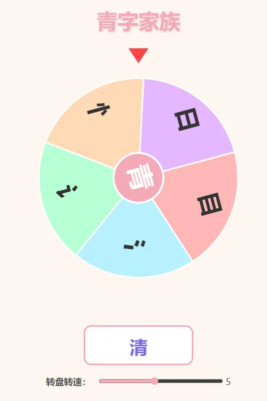 做一个一年级学生课堂生字组词大转盘,顶部显示“青字家族”的大标题,注意标题颜色和背景相匹配,马卡龙色系,大转盘中心是一个圆圈按钮,明显地写着“青”字,圆盘的12点方向安排一个红色箭头,转盘分成5等份扇形,每一份扇形角度是72度,每一份扇形中间分别写着以下部首:”目,氵,讠、忄、日”,大转盘旁边有一个文本方框用于显示部首对应的汉字:睛、清、请、情、晴。转盘角度为0(3点钟方向),效果要求:点击转盘中心的圆圈按钮,转盘开始顺时针旋转,等待5秒钟转盘停止转动,箭头指到哪个扇形区域内,文本框就显示该扇形的部首对应的汉字(例如,箭头指向目,文本框内就显示睛)确保部首加上青字之后能够一一对应。此外,在转盘下方可以调节转盘的转速。Canvas 绘制转盘扇形、箭头和文字,通过旋转画布实现转盘转动。国内稳定 CDN(bootcdn)加载 Bootstrap 和 jQuery,避免访问失败。