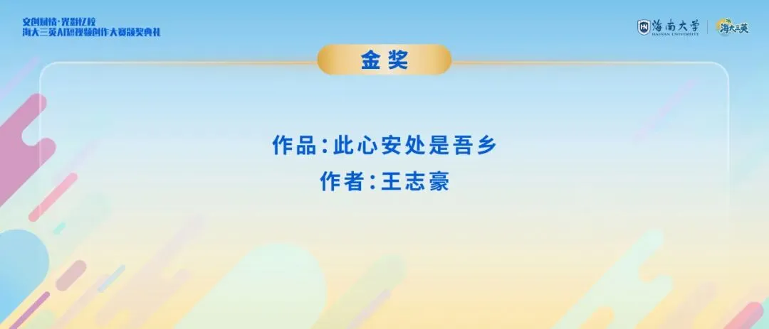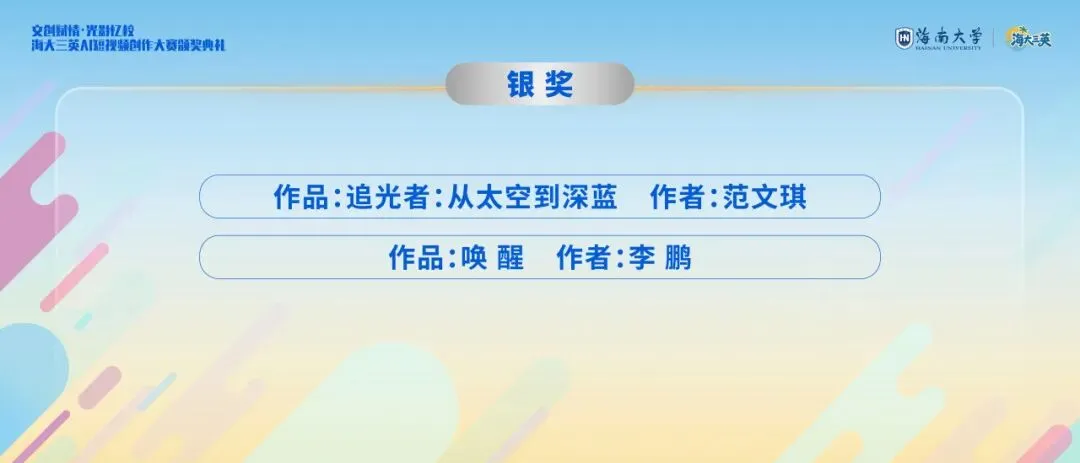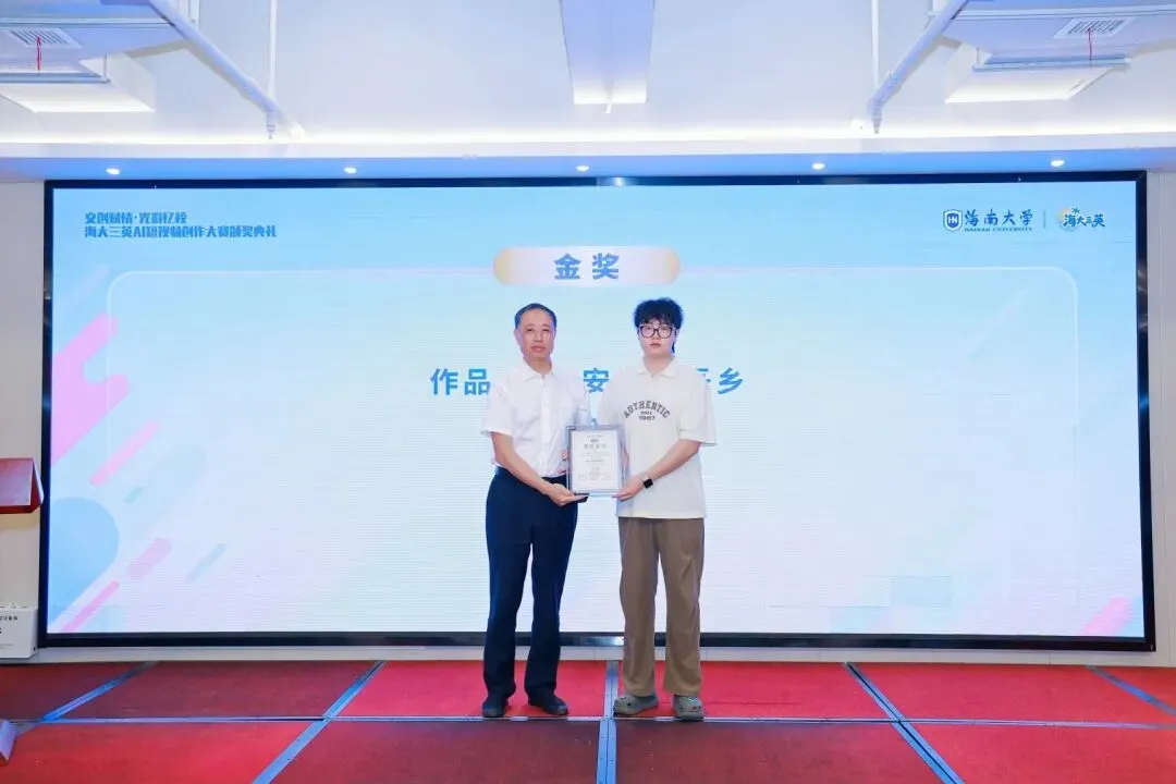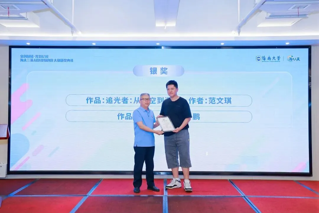 颁奖典礼现场氛围热烈而庄重,海南大学党委常委、副校长邱锡光、海南大学党委常委、副校长邹勇华莅临现场,为获奖选手颁奖并致以祝贺。颁奖环节中,获奖选手依次上台领取荣誉证书,掌声与欢呼声此起彼伏,每一份奖项的背后,都是同学们日夜打磨的匠心,是对AI创作的热爱与坚守。