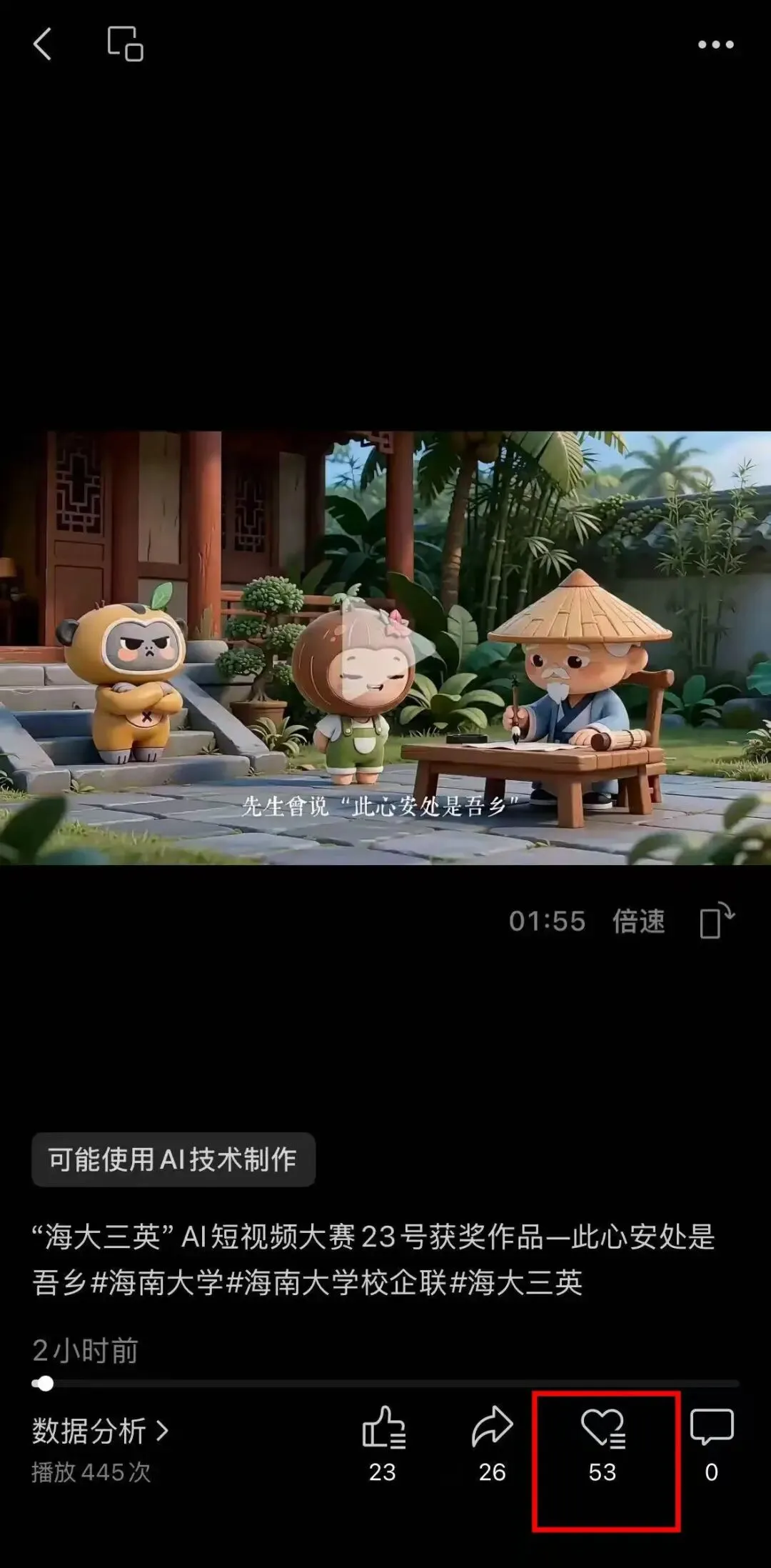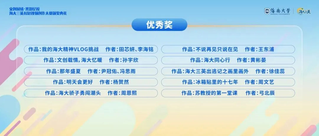 我们会在微信视频号【海南大学校企联】上陆续发布获奖作品,每个作品设10天的爱心收集期,十天之后我们根据每个作品的爱心数量取前三名作为人气奖获得者,颁发奖状证书和奖金奖品,欢迎大家积极参与并热情点赞!