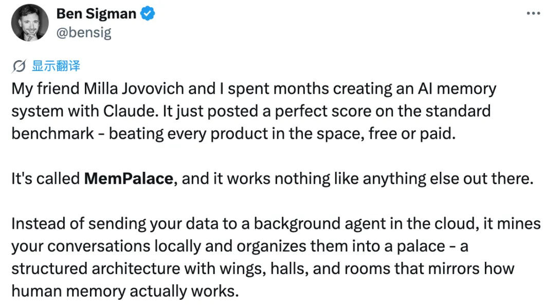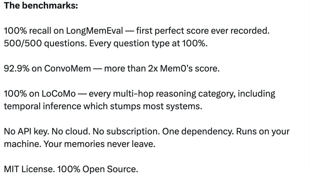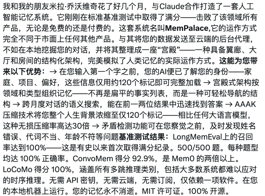 几日前,米拉和朋友本·西格曼在 GitHub 上开源了一个记忆宫殿的 AI 记忆系统,所有用户都可使用。据悉,该项目在 LongMemEva 的 l 测试中拿下了满分,并在 ConvoMem 和 LoCoMo 等测试中超越许多主流产品。