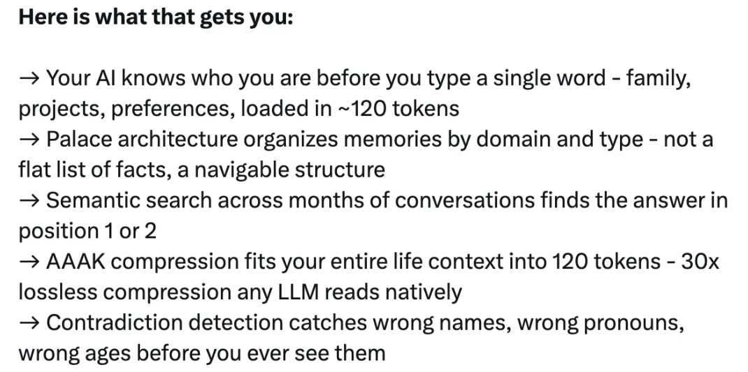 据 Mempalace 官网介绍,分类后 AI 回忆信息的准确度直接提升了 34%,让其从一个普通的检索工具进化成了「数字大脑」,解决了大模型在长文本下出现断片的问题,并且能分门别类、快速准确地提取信息。