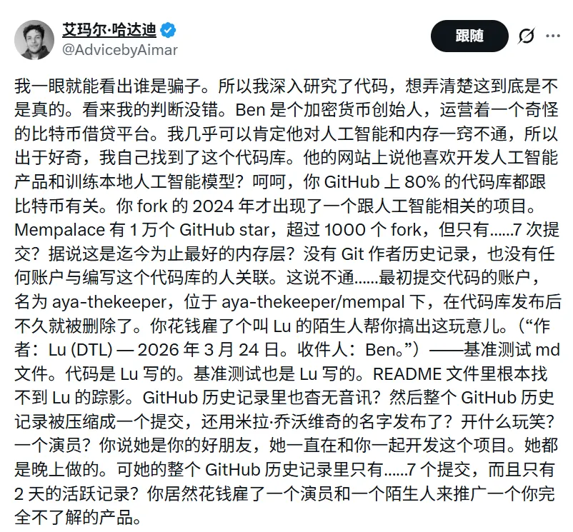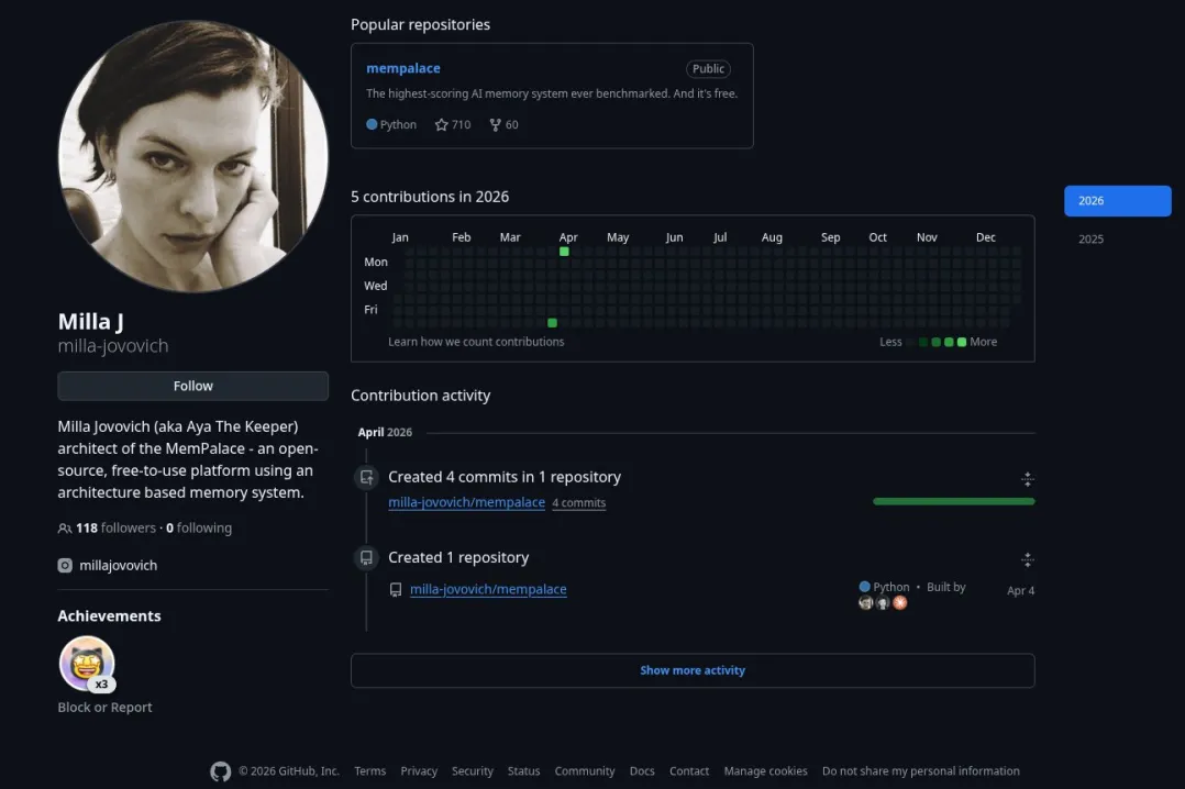 虽然米拉本人在视频中展示了自己使用 Claude Code 的编程过程,但有人发现,她似乎只是一个 MemPalace 的「代言人」,她在 GitHub 上的历史记录是空缺的,且活跃时间非常短暂。