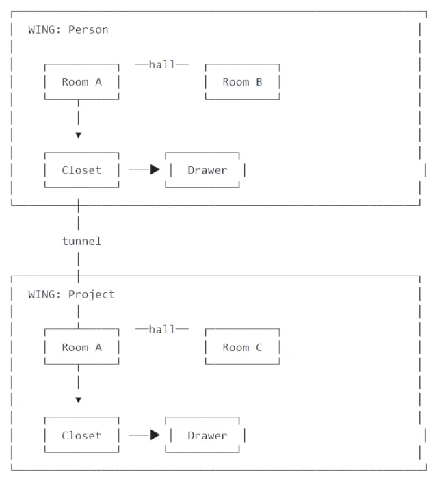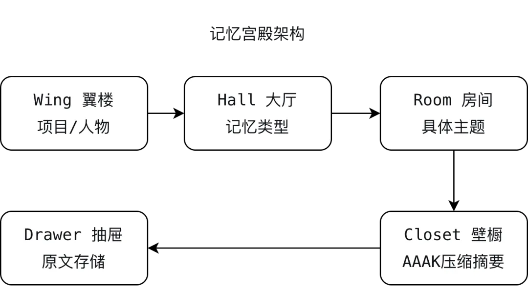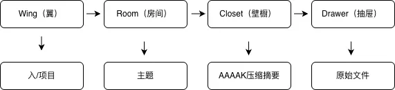 Wing(侧厅)用来存放个人或者项目的所有内容;Room(房间)用来存放聊天或文件的话题和主题;Closet(壁橱)用来放置被 AI 压缩好的精简版摘要;Drawer(抽屉)负责存放最原始的完整文件。