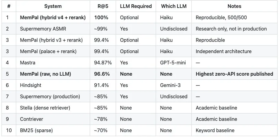 我们可以先看看本·西格曼在社媒上分享这张图片,清晰展示了 MemPalace(图中简称 MemPal)与其竞争对手在 AI 检索性能上的对比测试结果。