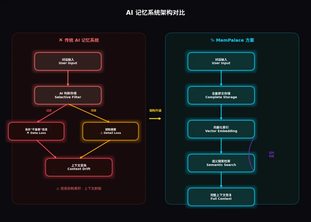 基于这些理论,记忆宫殿首先要解决的问题是:无论大模型有多大的上下窗口容量,AI 依旧会忘记对话早期的核心细节。
