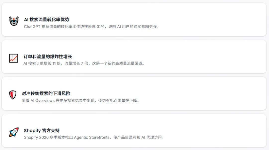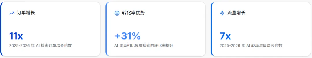 Shopify 官方报告显示:从2025 年1 月到2026 年1 月,来自AI 搜索的订单增长了约11 倍,AI 驱动的流量增长了约7 倍。