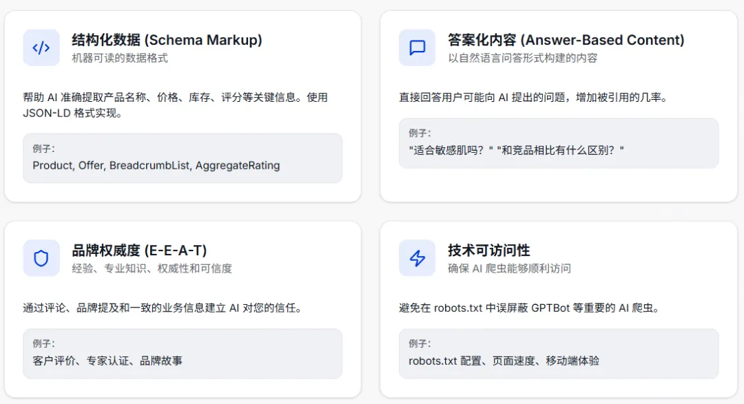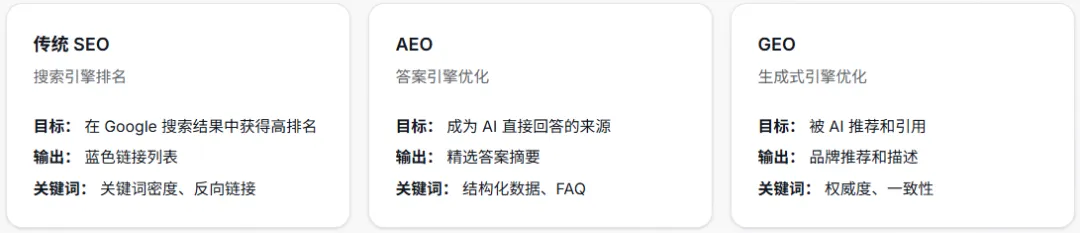 ·AEO(答案引擎优化):目标是成为 AI 直接回答的来源,输出是精选答案摘要,核心抓手是结构化数据和FAQ。