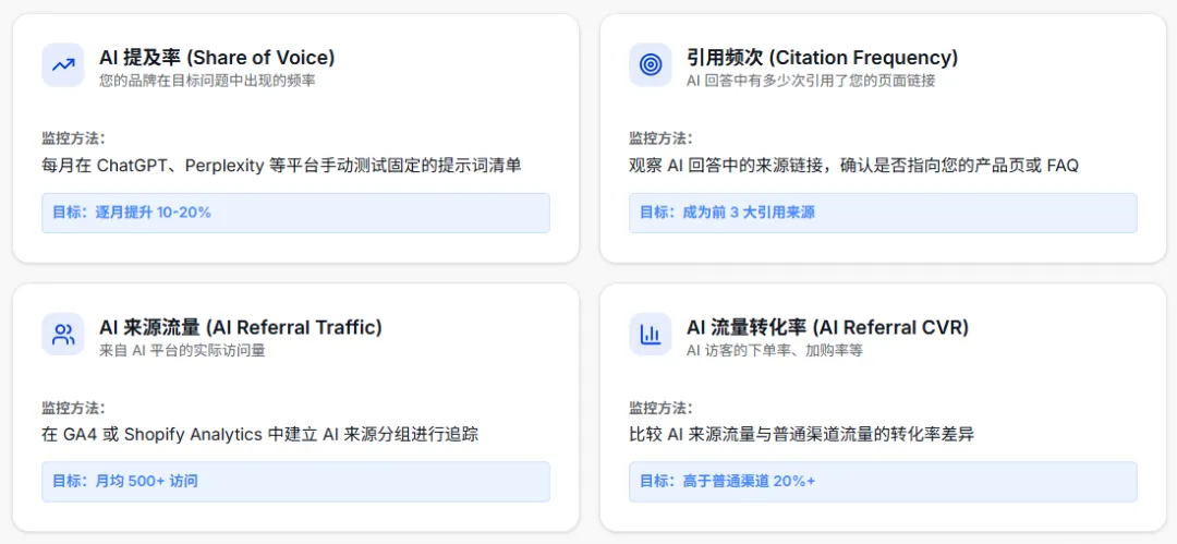 ·AI 来源流量(AI Referral Traffic):来自 AI 平台的实际访问量。在GA4 或Shopify Analytics 中建立AI 来源分组追踪。目标:月均500+ 访问。