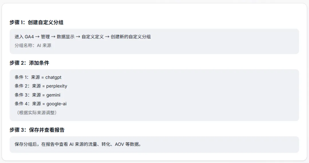 在 GA4 里追踪AI 流量的方法:进入管理 → 数据显示 → 自定义定义 → 创建新的自定义分组,命名为"AI 来源",添加条件:来源= chatgpt / perplexity / gemini / google-ai,保存后即可在报告中查看AI 来源的流量、转化、AOV 等数据。