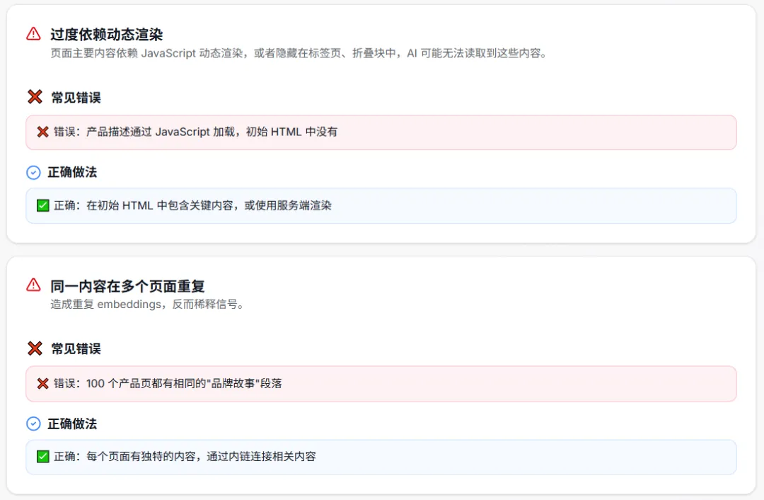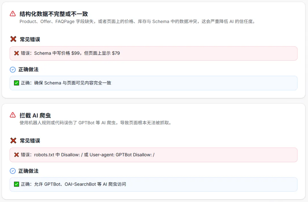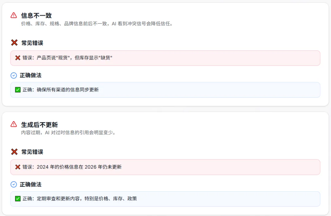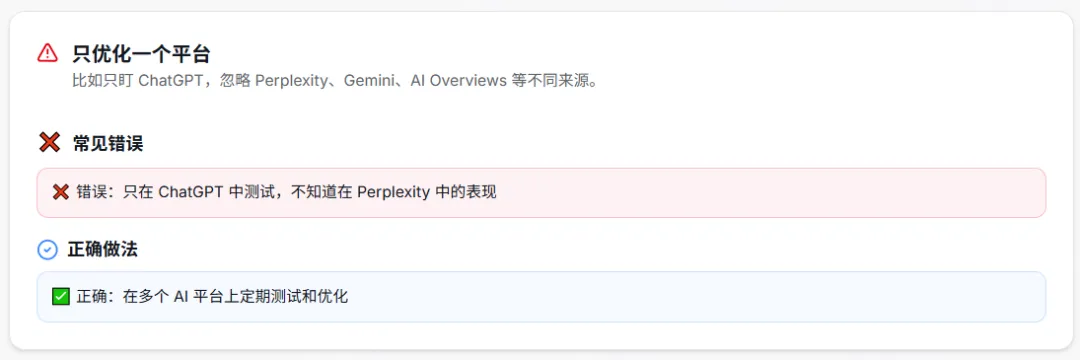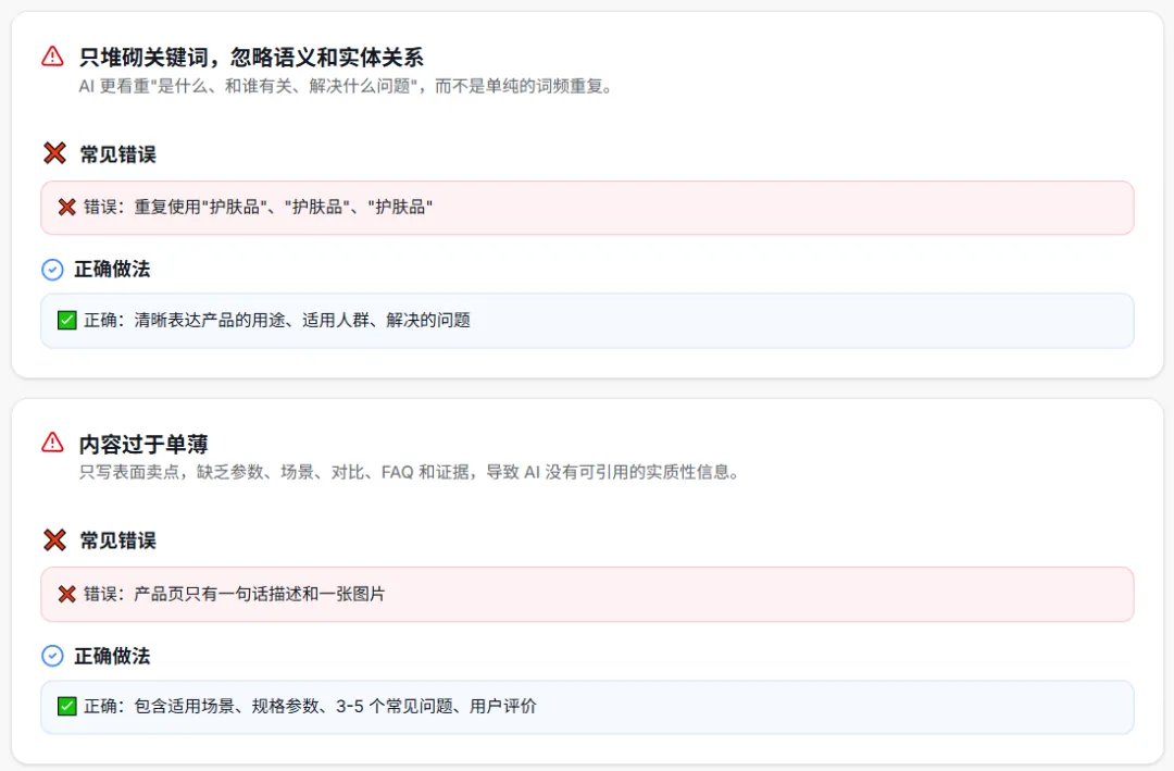 在进行GEO 优化时,最常见的错误就是仍然使用传统 SEO 的思路来应对 AI 搜索。以下是一些需要避免的常见陷阱。