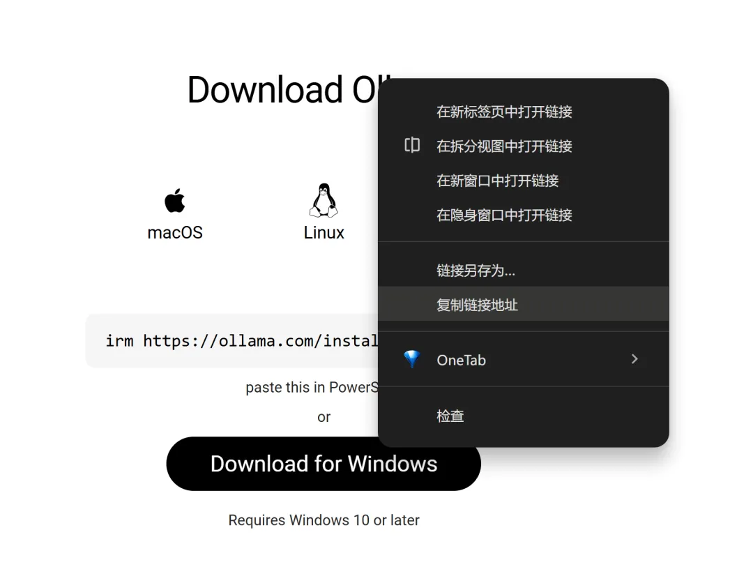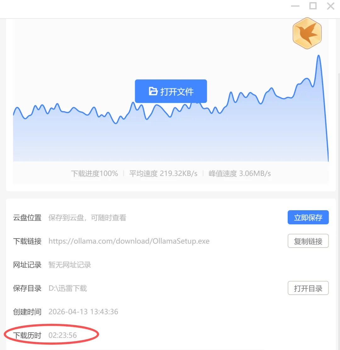 我尝试命令行下载:irm https://ollama.com/install.ps1 | iex速度太慢了,1个小时到 40% ,然后居然中断了,再试两次还是会中断,果断放弃~又尝试,直接点击 download for windows 按钮,发现下载更是龟速,完全不动啊!!我又百度找了下,发现迅雷可以下载(没开会员,平均200多KB/s),也比较快,所以打开迅雷,花了快两个半小时,下载好了ollama,默认下载到C盘。右键 download for windows,复制下载链接:
