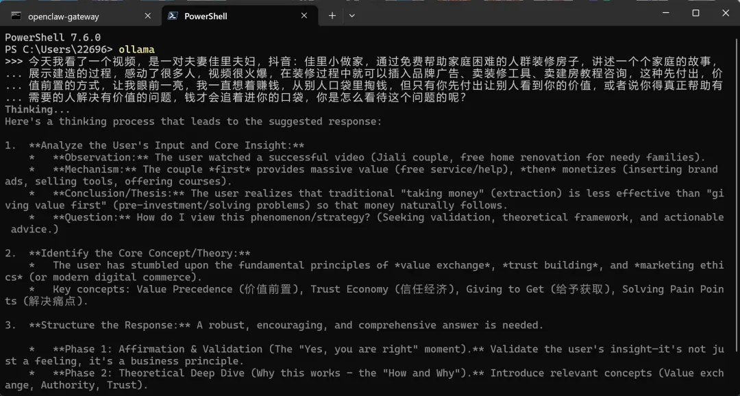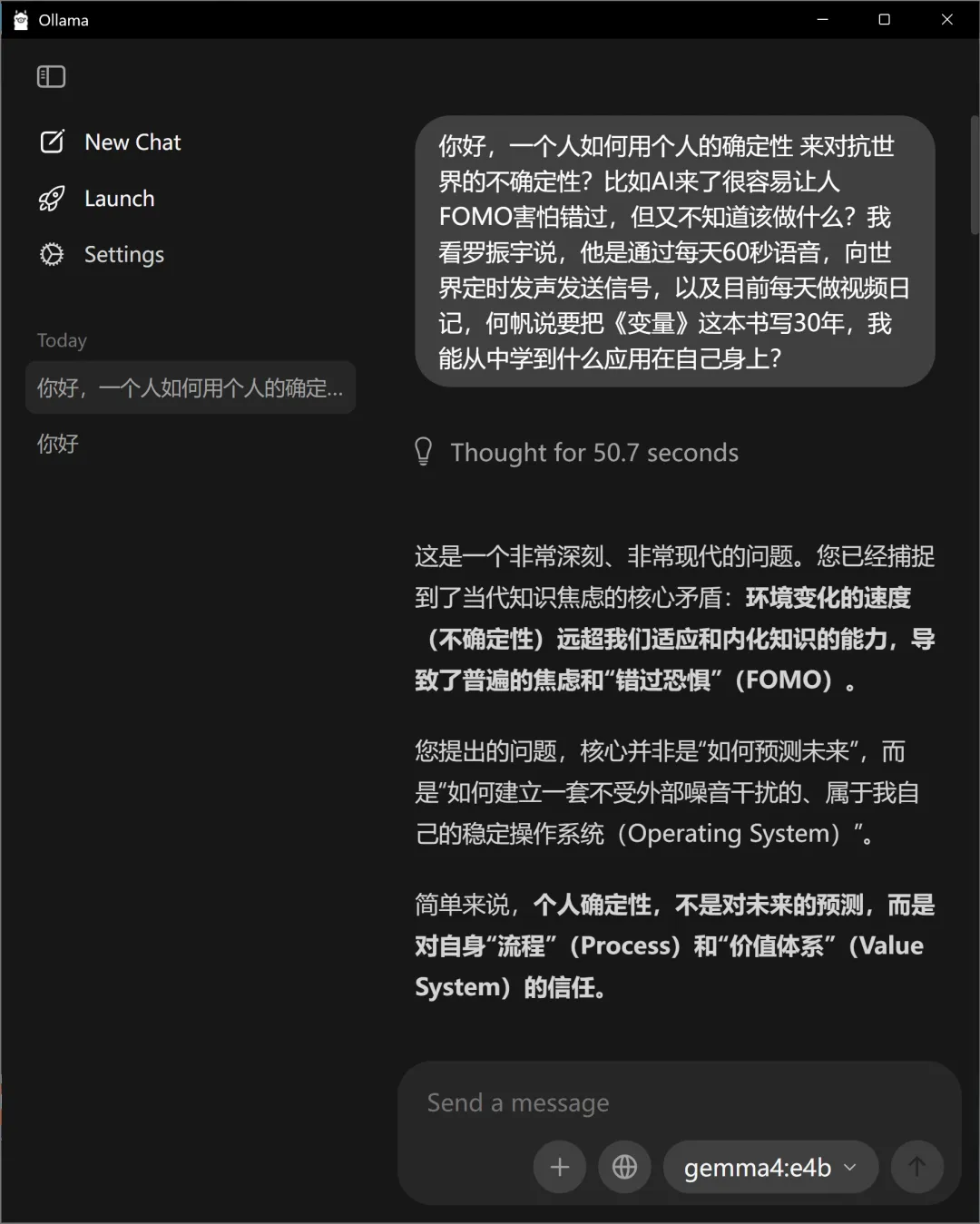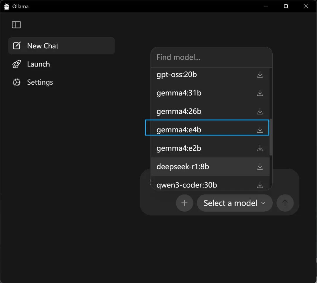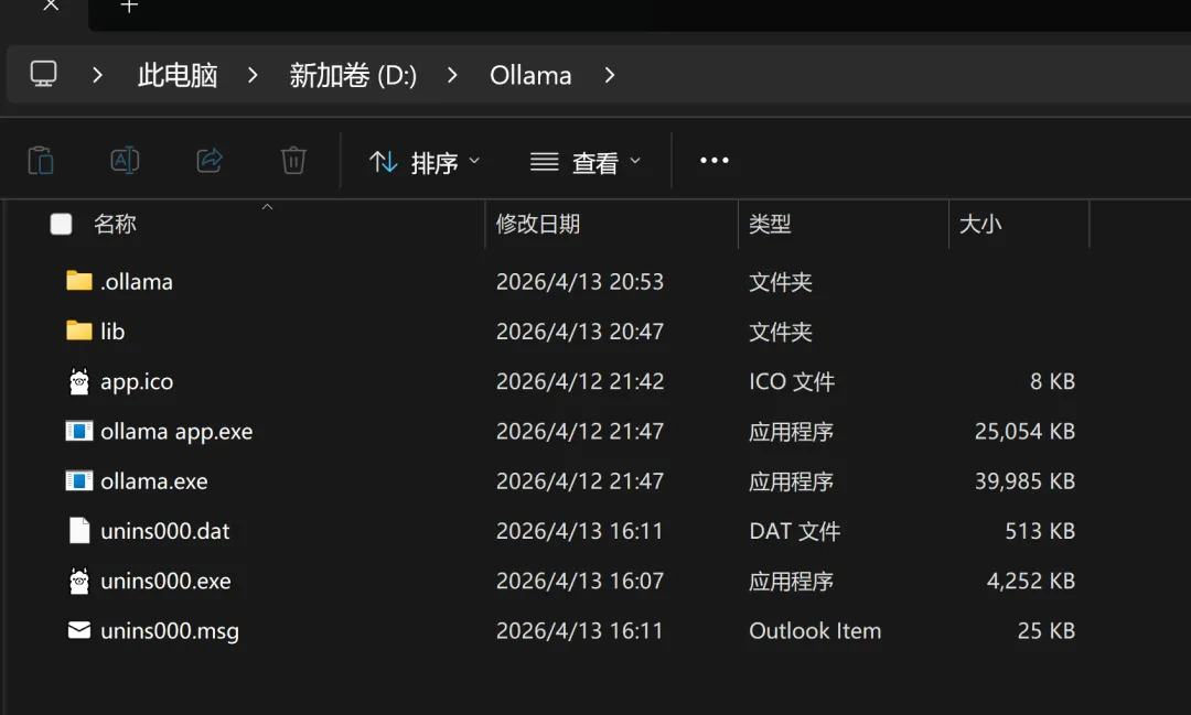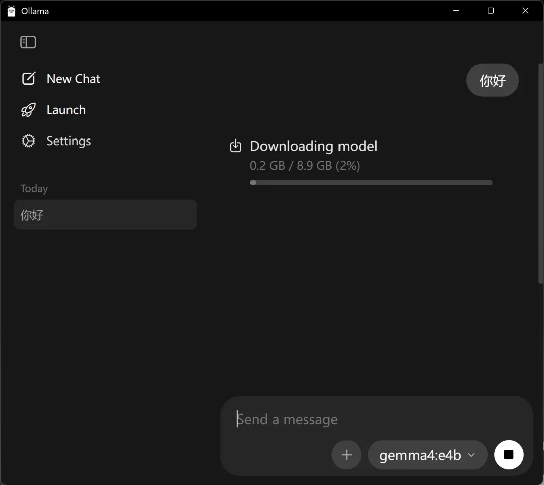 下载好之后,点开就自动安装ollama:ollama下载好之后,点击 new chat 按钮:我的电脑是windows11、Xiaomi Book Pro16(设置--系统 里面有设备信息),问了deepseek,推荐我选择选择 gemma4:e4b:我发送:你好。就开始自动下载模型文件了:晕啊,又下载了1个多小时,终于下载好!!果然能用了,而且我发现回答质量挺高呀,怎么感觉和deepseek R1有的一拼,是我的错觉嘛,哈哈~但是但是,我的 C盘,又快满了,晕啊~就剩 10 个G了,不行,我得把 ollama 和 gemma4 移到 D盘,不然电脑没法用了。搜索,打开ollama文件夹位置