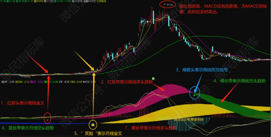月线MACD:黄色丝带代表多头趋势,蓝色丝带代表空头趋势,笑脸是月线金叉,哭脸是月线死叉