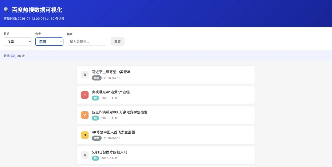 用cron每天早上9点自动抓取30条保存到数据库 每周日自动生成周趋势分析报告 一个月后就能看到完整热点变化曲线