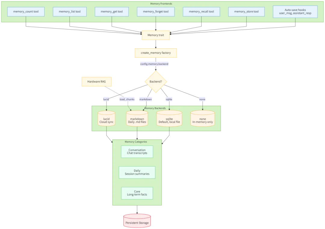 Frontend (AutoSave/Tools) → Memory trait → create_memory factory│▼Backend? (config.memory.backend)│┌─────────────────────────┼─────────────────────────┐│ │ │▼ ▼ ▼sqlite markdown lucid│ │ │└─────────────────────────┼─────────────────────────┘│▼Memory Categories(Conversation / Daily / Core)│▼Persistent Storage