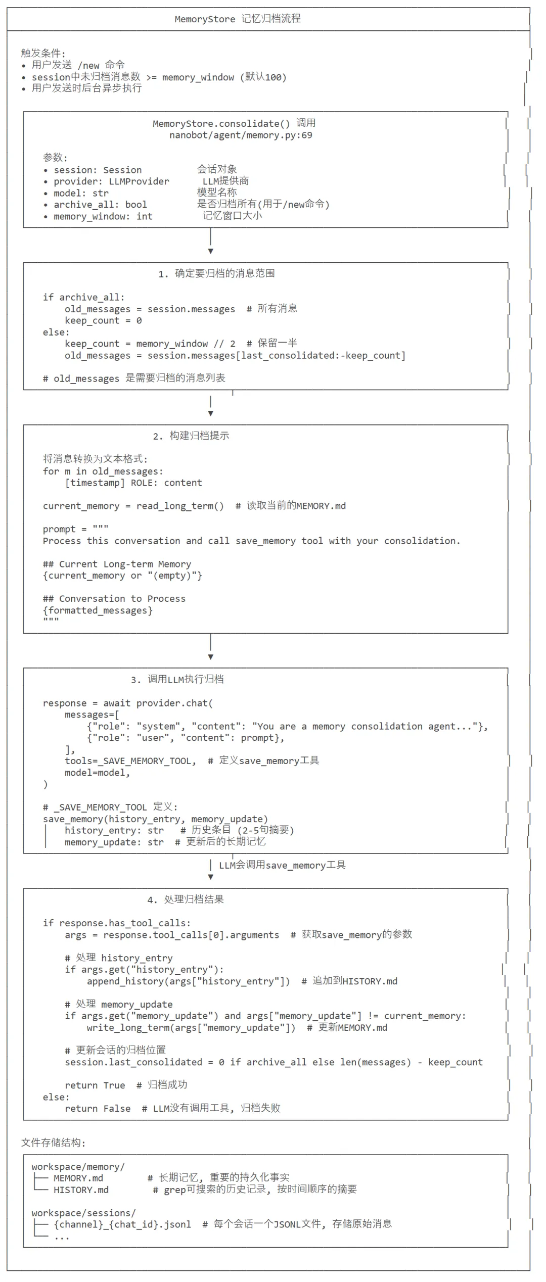 # ===================== 核心类定义 =====================class MemoryStore:"""Two-layer memory: MEMORY.md (long-term facts) + HISTORY.md (grep-searchable log)."""def __init__(self, workspace: Path):# 初始化记忆目录(确保目录存在,不存在则创建)self.memory_dir = ensure_dir(workspace / "memory")# 定义长期记忆文件路径(MEMORY.md)self.memory_file = self.memory_dir / "MEMORY.md"# 定义历史日志文件路径(HISTORY.md)self.history_file = self.memory_dir / "HISTORY.md"def read_long_term(self) -> str:"""读取长期记忆文件内容"""# 检查文件是否存在if self.memory_file.exists():# 读取文件内容(UTF-8编码保证中文等字符正常)return self.memory_file.read_text(encoding="utf-8")# 文件不存在时返回空字符串return ""def write_long_term(self, content: str) -> None:"""写入内容到长期记忆文件(覆盖写入)"""self.memory_file.write_text(content, encoding="utf-8")def append_history(self, entry: str) -> None:"""追加内容到历史日志文件(不会覆盖原有内容)"""# 以追加模式打开文件(a),UTF-8编码with open(self.history_file, "a", encoding="utf-8") as f:# 去除entry末尾的空白符,添加两个换行(分隔不同条目)后写入f.write(entry.rstrip() + "\n\n")def get_memory_context(self) -> str:"""生成格式化的长期记忆上下文(供Agent对话使用)"""# 读取当前长期记忆内容long_term = self.read_long_term()# 有内容时返回格式化字符串,无内容时返回空字符串return f"## Long-term Memory\n{long_term}" if long_term else ""async def consolidate(self,session: Session,provider: LLMProvider,model: str,*,archive_all: bool = False,memory_window: int = 50,) -> bool:"""Consolidate old messages into MEMORY.md + HISTORY.md via LLM tool call.Returns True on success (including no-op), False on failure."""# 分支1:全量归档模式(archive_all=True)if archive_all:# 取所有会话消息作为待整合的旧消息old_messages = session.messages# 全量归档后不保留旧消息(keep_count=0)keep_count = 0# 记录日志:全量归档的消息数量logger.info("Memory consolidation (archive_all): {} messages", len(session.messages))# 分支2:增量归档模式(默认)else:# 计算保留的消息数量(记忆窗口的一半,避免频繁整合)keep_count = memory_window // 2# 若会话消息总数 ≤ 保留数量,无需整合,直接返回成功if len(session.messages) <= keep_count:return True# 若自上次整合后无新消息,无需整合,直接返回成功if len(session.messages) - session.last_consolidated <= 0:return True# 提取待整合的旧消息:从上次整合位置到倒数keep_count条old_messages = session.messages[session.last_consolidated:-keep_count]# 若待整合消息为空,直接返回成功if not old_messages:return True# 记录日志:待整合消息数量、保留消息数量logger.info("Memory consolidation: {} to consolidate, {} keep", len(old_messages), keep_count)# 构建待整合的对话文本(带时间戳、角色、工具使用信息)lines = []for m in old_messages:# 跳过无内容的消息if not m.get("content"):continue# 拼接工具使用信息(若有)tools = f" [tools: {', '.join(m['tools_used'])}]" if m.get("tools_used") else ""# 格式化每行内容:[时间戳] 角色(大写) [工具信息]: 消息内容lines.append(f"[{m.get('timestamp', '?')[:16]}] {m['role'].upper()}{tools}: {m['content']}")# 读取当前长期记忆内容current_memory = self.read_long_term()# 构建LLM提示词:告知LLM需要整合对话并调用save_memory工具prompt = f"""Process this conversation and call the save_memory tool with your consolidation.## Current Long-term Memory{current_memory or"(empty)"}## Conversation to Process{chr(10).join(lines)}"""try:# 调用LLM接口,触发记忆整合response = await provider.chat(messages=[# 系统提示:定义LLM的角色为记忆整合代理{"role": "system", "content": "You are a memory consolidation agent. Call the save_memory tool with your consolidation of the conversation."},# 用户提示:传入待整合的对话和当前记忆{"role": "user", "content": prompt},],tools=_SAVE_MEMORY_TOOL, # 传入save_memory工具描述model=model, # 指定使用的LLM模型)# 检查LLM是否调用了save_memory工具if not response.has_tool_calls:# 未调用工具时记录警告日志,返回失败logger.warning("Memory consolidation: LLM did not call save_memory, skipping")return False# 提取工具调用的参数(取第一个工具调用的参数)args = response.tool_calls[0].arguments# 兼容处理:部分LLM返回的参数是JSON字符串,需解析为字典if isinstance(args, str):args = json.loads(args)# 校验参数类型:必须是字典,否则返回失败if not isinstance(args, dict):logger.warning("Memory consolidation: unexpected arguments type {}", type(args).__name__)return False# 处理历史条目:追加到HISTORY.mdif entry := args.get("history_entry"):# 确保entry是字符串类型(非字符串则转为JSON字符串)if not isinstance(entry, str):entry = json.dumps(entry, ensure_ascii=False)# 追加到历史日志文件self.append_history(entry)# 处理记忆更新:写入MEMORY.md(仅当内容变化时)if update := args.get("memory_update"):# 确保update是字符串类型(非字符串则转为JSON字符串)if not isinstance(update, str):update = json.dumps(update, ensure_ascii=False)# 仅当内容与当前记忆不同时才写入(避免无意义的写入)if update != current_memory:self.write_long_term(update)# 更新会话的最后整合位置:# - 全量归档:重置为0# - 增量归档:设为当前消息总数 - 保留数量session.last_consolidated = 0 if archive_all else len(session.messages) - keep_count# 记录日志:记忆整合完成logger.info("Memory consolidation done: {} messages, last_consolidated={}", len(session.messages), session.last_consolidated)# 返回成功return Trueexcept Exception:# 捕获所有异常,记录错误日志logger.exception("Memory consolidation failed")# 返回失败return False