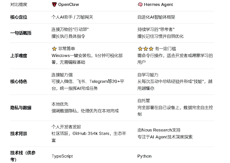 在技术层面,OpenClaw主要使用TypeScript,而Hermes基于Python。不过对普通用户而言,这个区别在日常使用中基本感受不到。