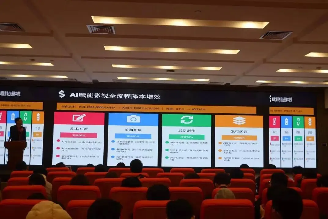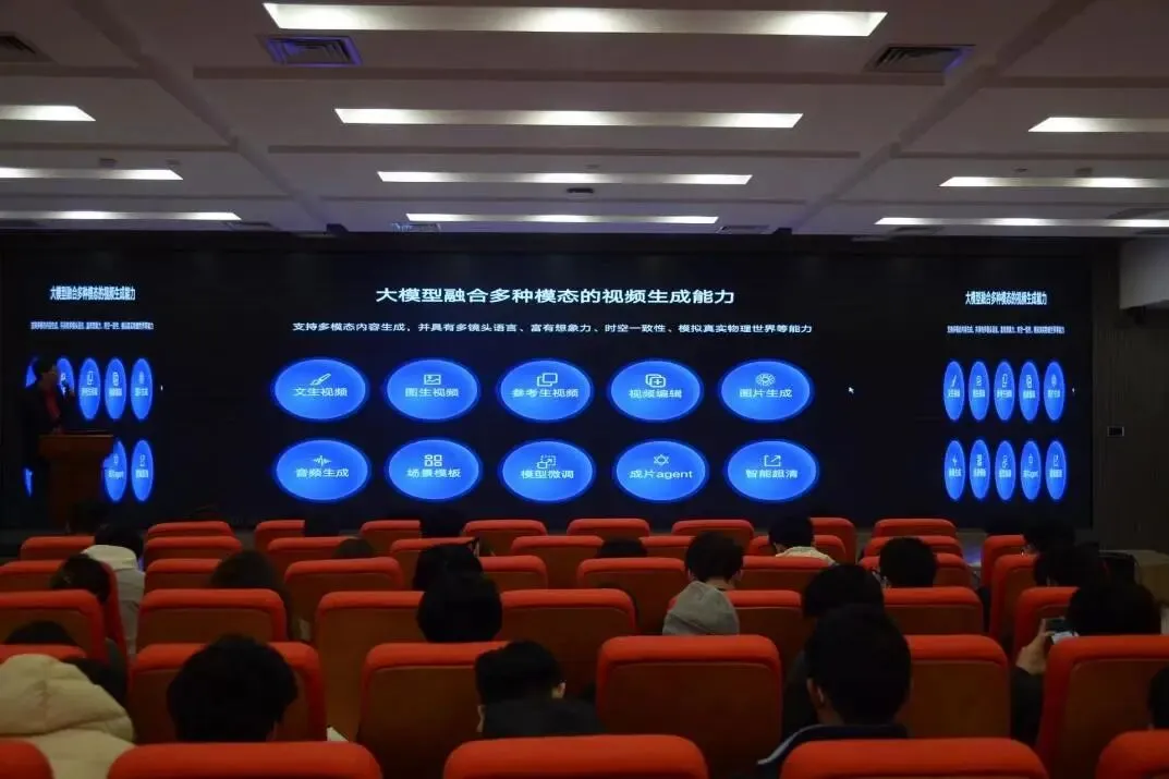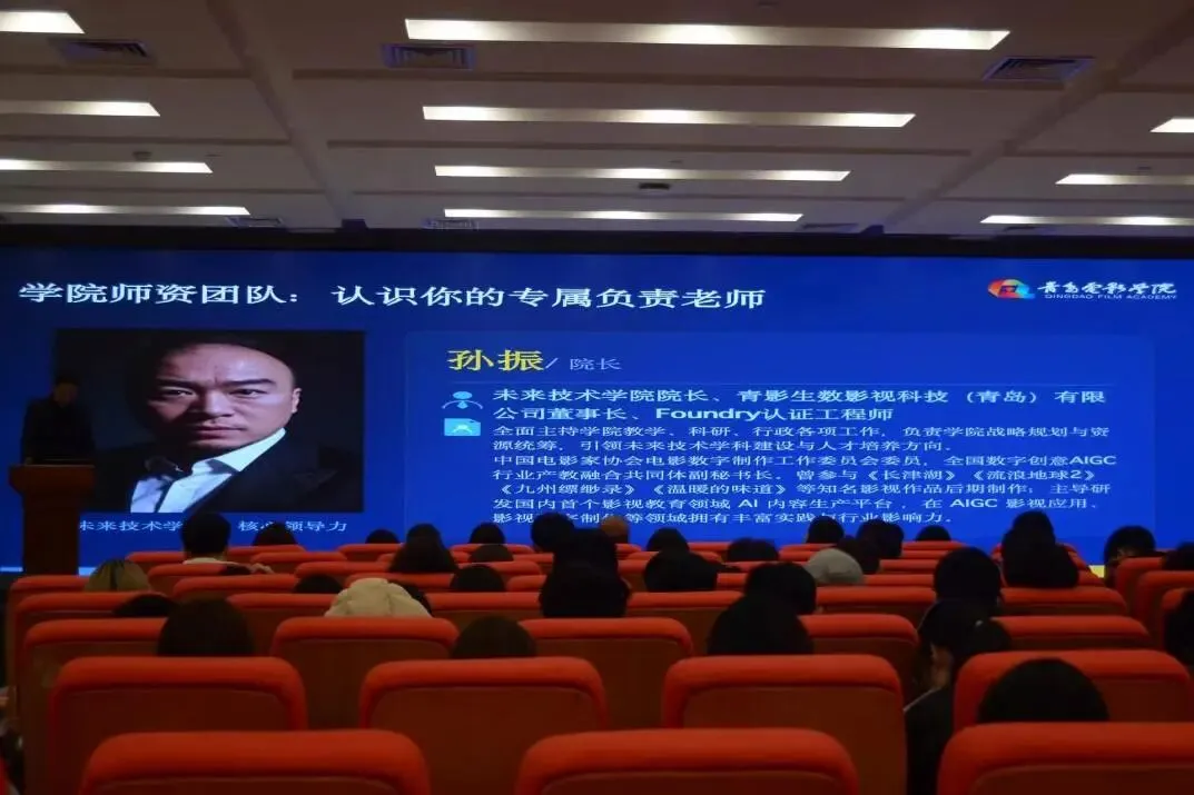 大会依次进行了学院及专业介绍、学生代表发言、院长致辞等环节。会上,孙振院长与刘翔远副院长重点介绍了由AIGC研究院主持开发的“金象AI平台”。该平台作为全校AIGC教学与实训的核心载体,覆盖创作、教学、竞赛、项目制作等全场景功能,全面支撑影视创作与实践教学。