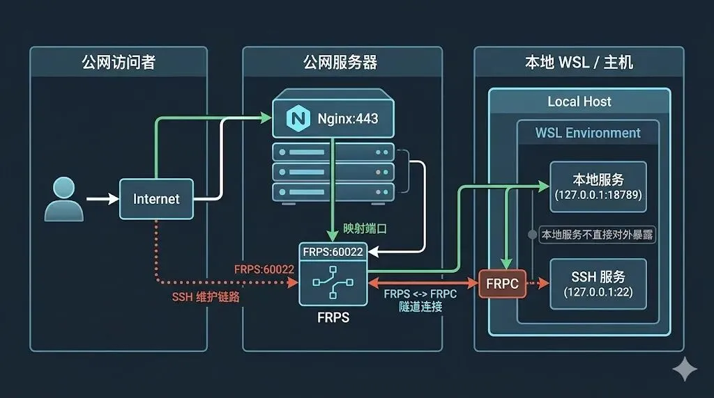 Internet -> Nginx:443 -> FRPS映射端口 -> FRPC -> WSL:127.0.0.1:服务端口