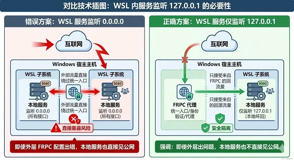 很多人出问题,往往不是 FRP 配不通,而是本地服务监听地址错了、或者误把 WSL 的服务开放成了对外可见。