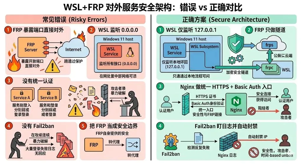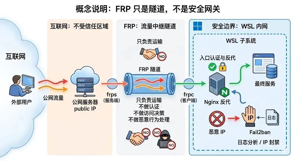 FRP 负责连通,Nginx 负责守门,Fail2ban 负责出手,WSL 后端负责藏好。
