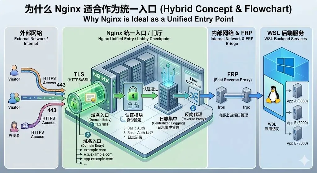 如果你的目标不是“临时打通一下”,而是想把一套跑在 WSL 里的服务,长期、稳定、相对安全地开放给公网访问,那么真正靠谱的做法,不是单点加固,而是把整条链路分层设计。