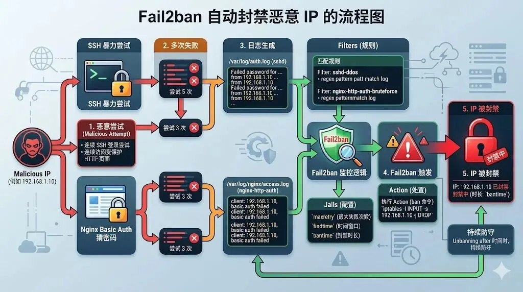 4. Fail2ban 行为层:负责根据日志自动封禁恶意 IP