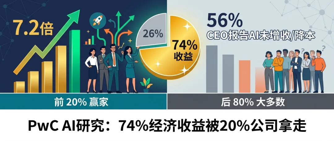 PwC的报告用数据证明了一件事:AI不是"大家都受益"的技术——它是赢家通吃的。前20%的公司拿走74%的价值,这在投资中意味着选对公司比选对赛道重要得多。